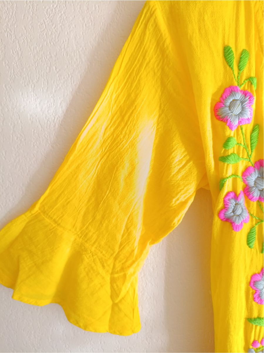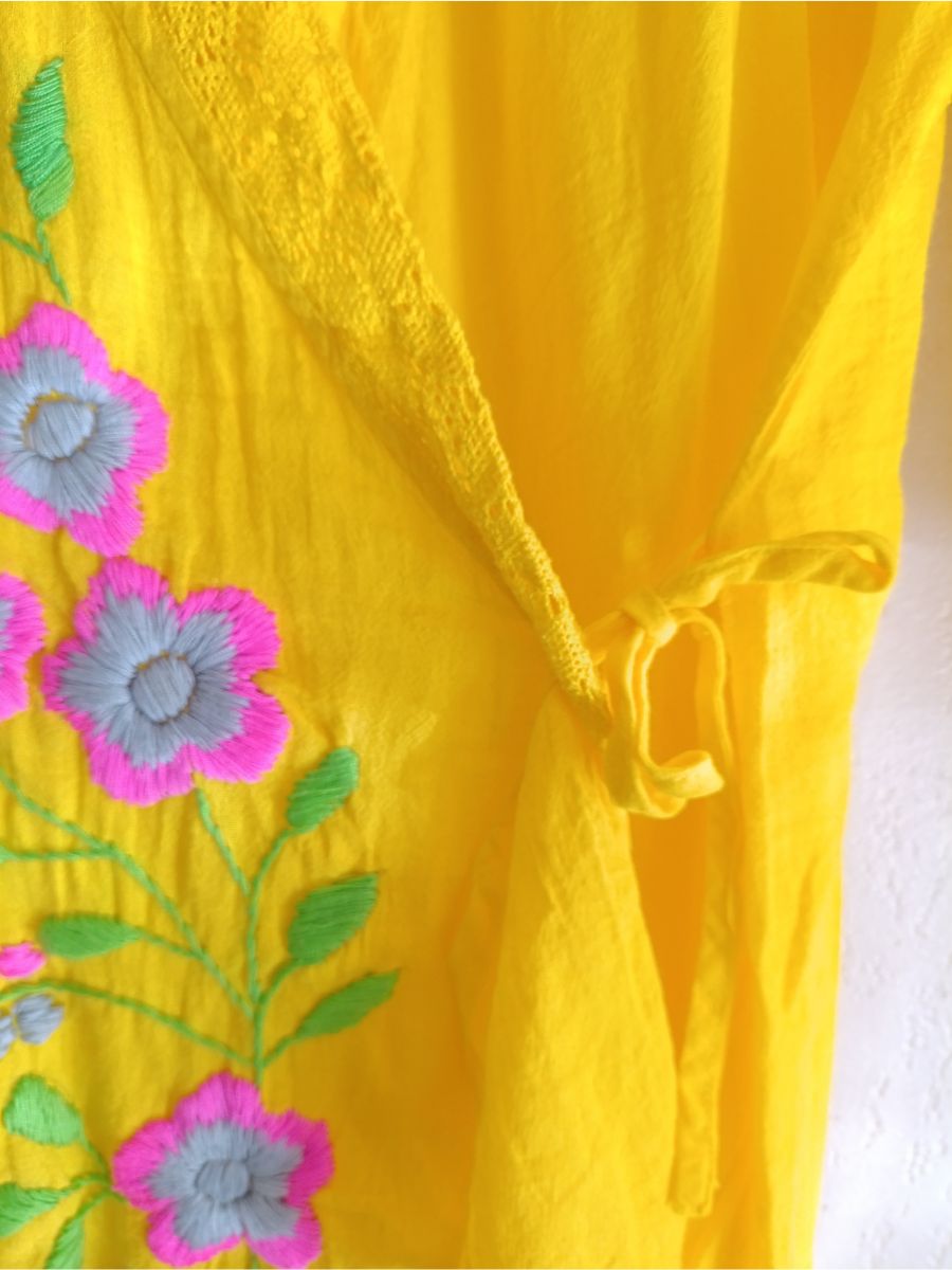 Son charme réside dans les sublimes broderies florales, réalisées avec soin le long du devant, apportant fraîcheur, raffinement et une touche artistique. Ce kimono se ferme avec un lien à la taille, façon portefeuille, pour une silhouette ajustable. Les manches 3/4 et les finitions délicates autour du col soulignent son aspect chic et décontracté à la fois.