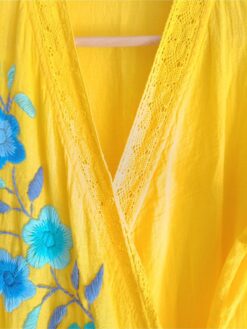 Son charme réside dans les sublimes broderies florales, réalisées avec soin le long du devant, apportant fraîcheur, raffinement et une touche artistique. Ce kimono se ferme avec un lien à la taille, façon portefeuille, pour une silhouette ajustable. Les manches 3/4 et les finitions délicates autour du col soulignent son aspect chic et décontracté à la fois.